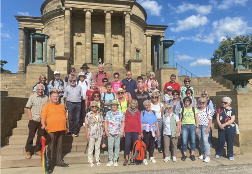 Die Mittwochswanderer des Schwäbischen Albvereins Epfendorf begaben sich ausnahmsweise am Donnerstag auf ihre Juli-Tour nach Esslingen am Neckar. In Esslingen wurde die Gruppe vom Kulturgauwart Jürgen Gruß zum Stadtspaziergang erwartet. Er zeigte uns die Stadt auf seine humorvolle Art, gespickt mit vielen interessanten Informationen der Stadt- und Landesgeschichte aus unterschiedlichen Jahrhunderten und sichtbaren Zeugen jener Zeiten. Zu bestaunen gab es herrliche mittelalterliche Fachwerkhäuser, Steinbrücken, schmucke Gassen und Plätze mit vielen Geschichten dazu. Auch die Burganlage und die Frauenkirche wurde mit einbezogen. Über die Burgstaffel mit mehr als 300 Stufen erklommen zahlreiche Wanderfreunde den Weg zur Burganlage. Im Toskana Besen wurde anschließend die Mittagsrast genossen, ergänzt durch die großartige Aussicht auf Stuttgart und die Weinberge. Die Grabkapelle auf dem Rotenberg, bekannt als das Schwäbische Taj Mahal, wurde auf dem Höhenweg von Rüdern aus, durch Gärten, Wald und Weinberge zu Fuß oder gemütlich mit dem Bus erreicht. Der Rotenberg, mit der Grabkapelle, ist ein romantischer und symbolträchtiger Ort mit einer großartigen Aussicht auf Stuttgart, den Schurwald, die Fildern und die Schwäbische Alb. Dort ließ die Wandergruppe vom Albverein Epfendorf ein schöner Ausflugs- und Wandertag ausklingen.