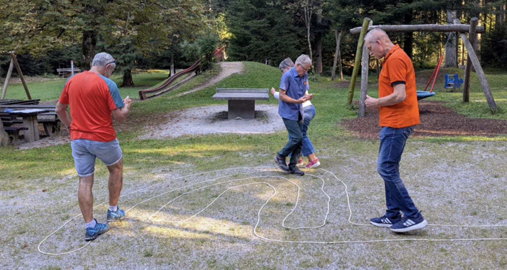 Zu Beginn trafen wir uns an „der Schnecke“ hierbei sollten die Teilnehmenden auf einem Seil, dass auf dem Boden lag, entlanglaufen, ohne das Seil zu verlassen. Dabei kamen sich die Teilnehmenden immer mal wieder in die Quere und mussten dieses „Dilemma“ ohne verbale Kommunikation lösen. Die nächste Schwierigkeitsstufe bestand darin ein Teelicht ebenfalls durch diesen „Parkour“ zu führen, ohne dass dabei das Lichtlein ausgeht und auch wie bei der ersten Übung ohne Sprechen und ohne das Seil zu verlassen. Die Teilnehmenden waren beeindruckt, wie fokussiert man sein musste, um die Aufgabe zu schaffen. Und danach mussten die Teilnehmenden noch schätzen, wie lang die Wegstrecke, also das Seil ist, dass Sie abgegangen waren. Niemand hat exakt gewusst, es gab aber einige, die nah dran waren. Die Länge wird hier nicht verraten, da es ggf. mal wieder zum Einsatz kommt.