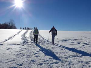 ist auf Schneeschuhen. Fast optimale Bedingungen herrschte beim Epfendorfer Albvereins-Schneeschuh Wochenende. Zuerst beim Warming-Up im Harzwald und tags drauf auf der Hochfläche der Schwäb. Alb bei Obernheim. Für einige Teilnehmer war es die Chance, diese Fortbewegungsart kennenzulernen. Aber auch erfahrene Schneeschuh-Wanderer hatten ihre Freude dabei. Es ist einfach etwas Besonderes, querfeldein seine Spuren im Schnee zu ziehen. Nach anfänglichen Bedenken bezüglich der eisigen Kälte – bei der Abfahrt morgens in Epfendorf hatte minus 15 °C herrschten auf 1000 m Höhe bei Obernheim durch die Inversionswetterlage beste Bedingungen knapp um den Gefrierpunkt bei herrlichstem Sonnenschein. Nur noch etwas Neuschnee wäre schöner gewesen. Die Teilnehmer waren gut 2 Stunden sportlich unterwegs.
