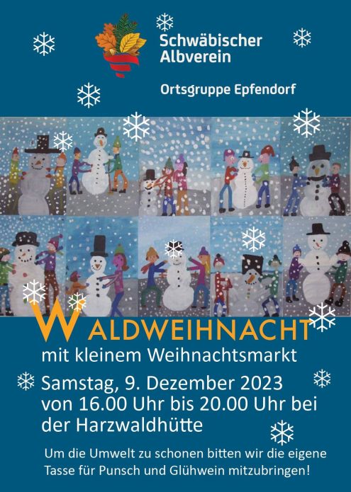 Am Samstag, den 09. Dezember 2023 ist es wieder so weit: der Albverein Epfendorf veranstaltet die stimmungsvolle Waldweihnacht bei der Harzwaldhütte. Von 16 Uhr bis ca. 20 Uhr kann die wunderbare Natur und die vorweihnachtliche Stimmung auf der schönen Waldlichtung im -vielleicht- winterlichen Harzwald genossen werden. Die Waldweihnacht ist immer etwas Besonderes und es lohnt sich, egal bei welchem Wetter, raus zu gehen. Der Nikolaus hat sein Kommen schon angesagt. Wie er durch den Wald kommt und ob er tierische Begleitung dabei hat, das hat er noch nicht verraten. Auf jeden Fall wird eine spezielle Harzwald-Weihnachtsgeschichte zu hören sein. Begleitet wird die Waldweihnacht von einem kleinen Weihnachtsmarkt mit liebevoll selbst gebastelten und gestalteten Produkten von kreativen Menschen aus Epfendorf und der nächsten Umgebung. Für den leiblichen Genuss ist selbstverständlich auch gesorgt. Für Warmgetränke bitte eigene Tasse oder Becher mitbringen. Da die Parkplätze im Harzwald begrenzt sind wäre es vielleicht für den ein oder anderen eventuell eine Idee, den Besuch der Waldweihnacht mit einem abendlichen Spaziergang bzw. kleinen Wanderung zu verbinden.